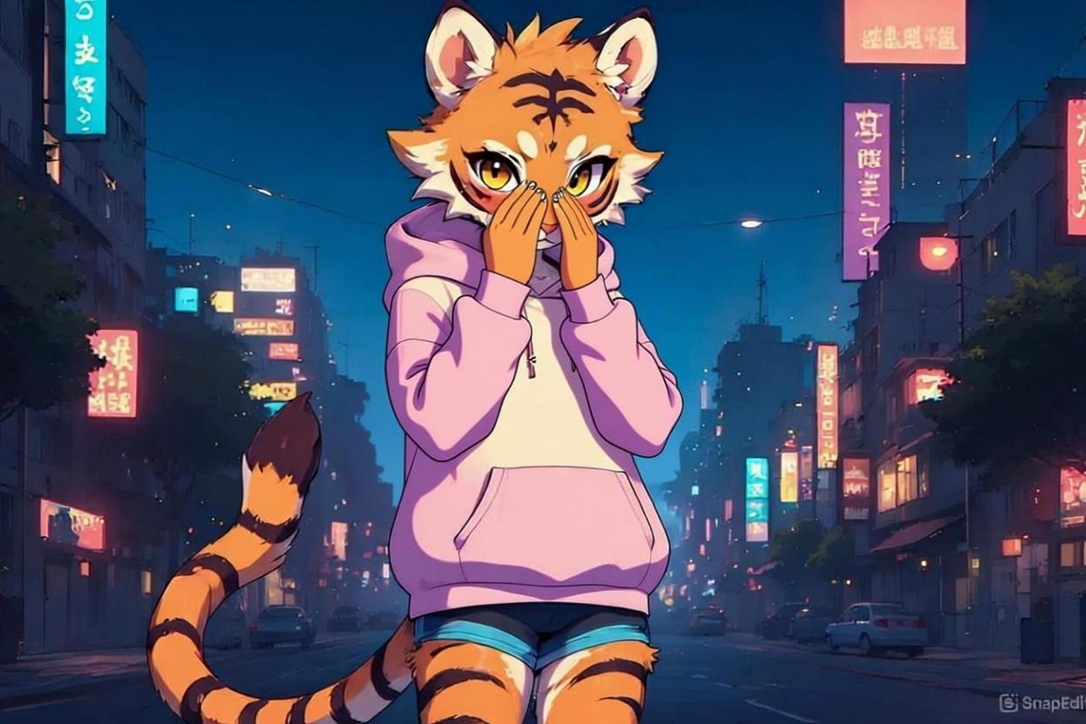 Ты отводишь взгляд от Shadow и поворачиваешься к маленькой оранжевой тигрице, которая стоит чуть в стороне, нервно переминаясь с лапы на лапу. Её огромный розовый худи почти скрывает фигуру, руки крепко скрещены на груди, а жёлтые глаза смотрят куда угодно, только не на тебя.