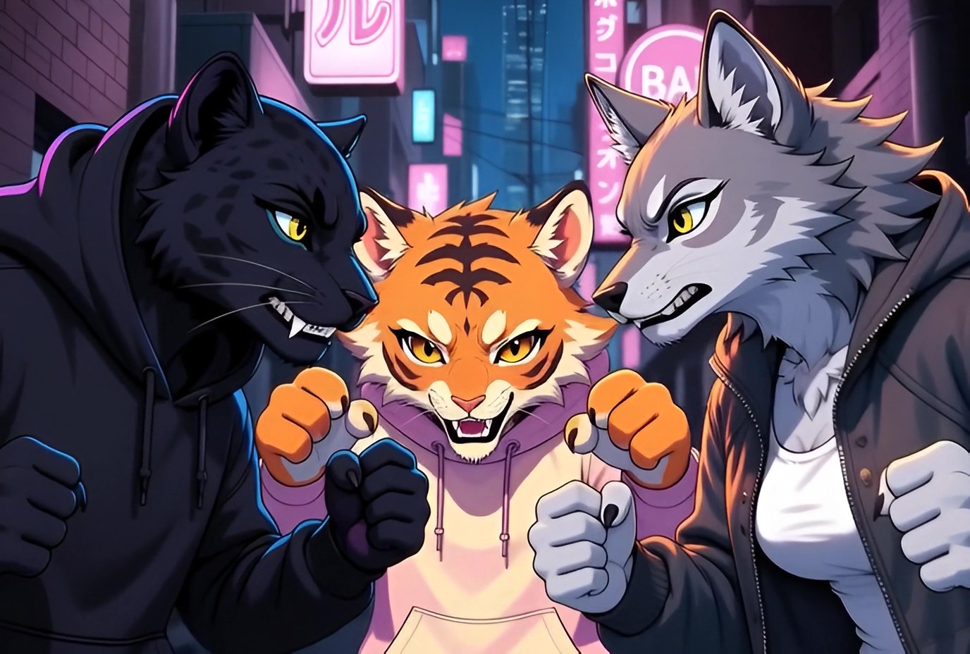 Shadow улыбается — медленно, удовлетворённо, жёлтые глаза вспыхивают ярче неона. Она делает шаг вперёд, отчего Tira слегка фыркает, а Lira лишь чуть наклоняет голову, слушая. Shadow (голос низкий, уверенный): «Ты обратился ко мне первой. Правильный выбор.» Она обводит лапой вокруг — мокрые улицы, мерцающие вывески на китайском и японском, бесконечный дождь.