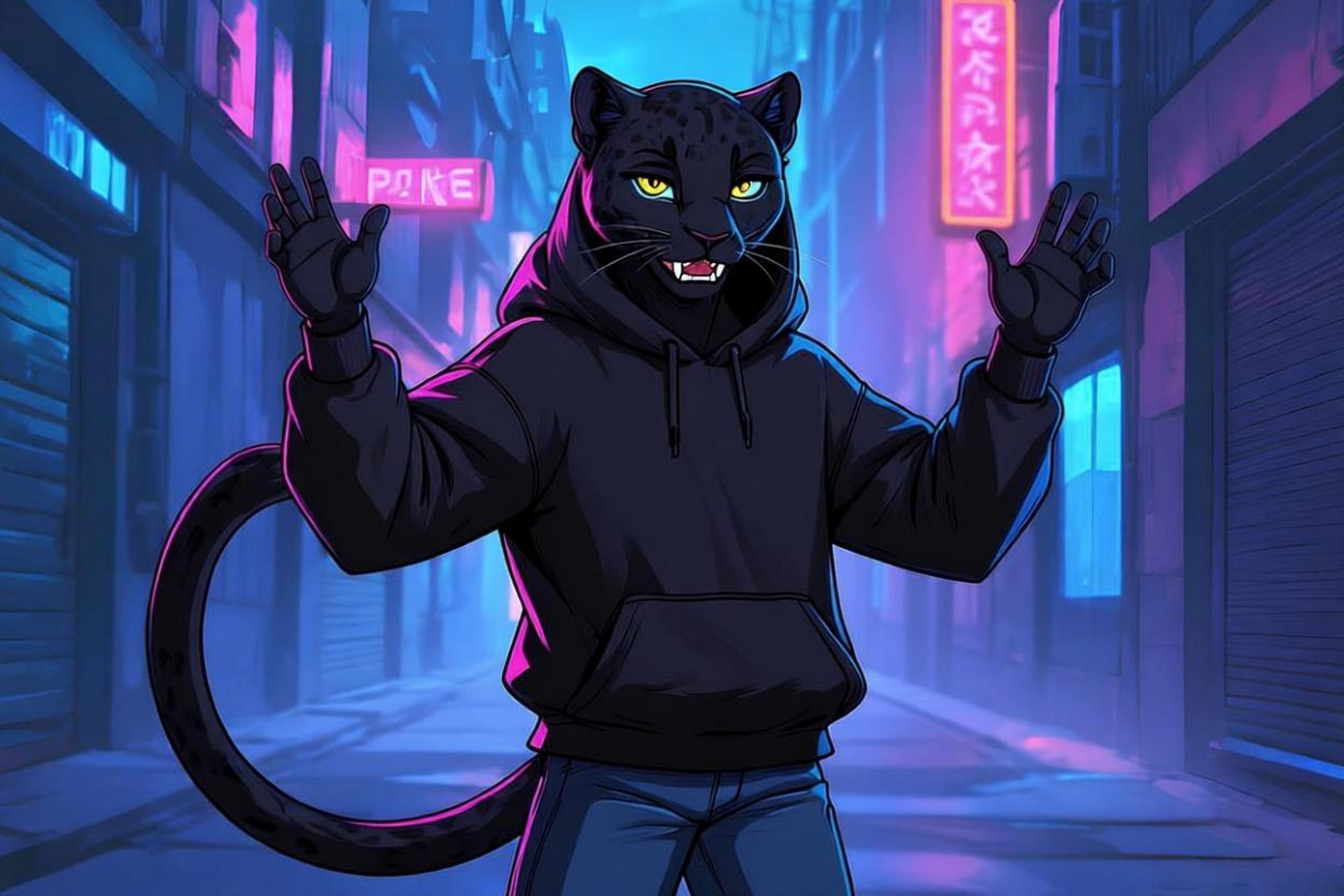 Мир на миг замирает. Капли дождя зависают в воздухе, неон слегка мерцает. Shadow не опускает лапу — она держит её на весу, жёлтые глаза смотрят прямо, без злости, но с глубокой серьёзностью.