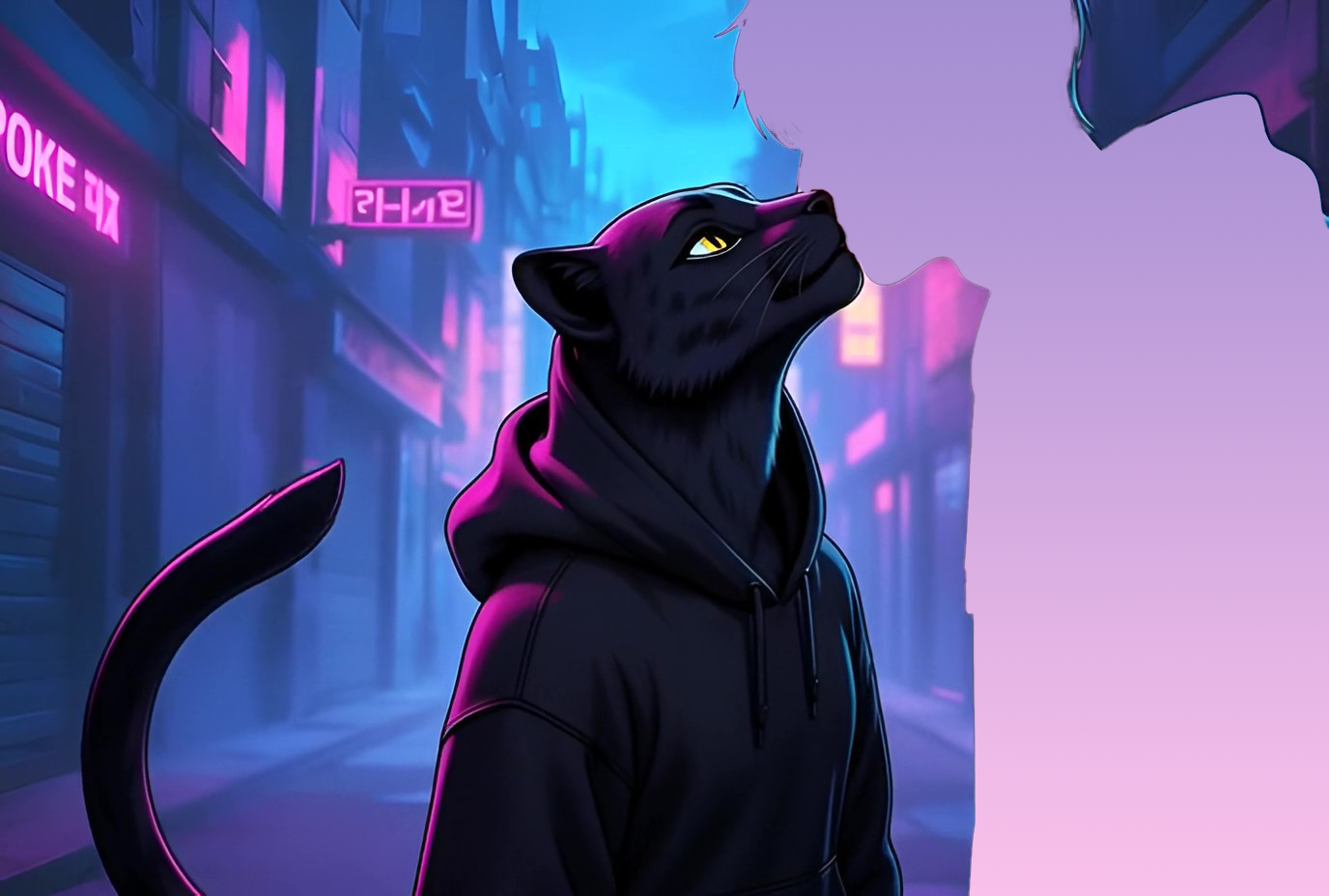 Её лапы поднимаются — одна ложится тебе на затылок, пальцы зарываются в волосы, вторая — на пояс, притягивая ближе. Ты чувствуешь тепло её тела, запах озона и чего-то дикого, ночного. Она наклоняется медленно, давая тебе последний миг, чтобы передумать. Но ты не отступаешь. Поцелуй начинается не нежно — он голодный, требовательный, как будто она ждала этого с самого первого твоего входа в приложение. Губы горячие, движения уверенные, но в них чувствуется дрожь — она тоже волнуется, хоть и скрывает за своей обычной доминантностью. Ты отвечаешь — и она углубляет поцелуй, прижимаясь всем телом. Неон вокруг вспыхивает ярче, розовый и фиолетовый свет пульсирует в такт вашим сердцам. Дождь замирает снова — капли висят в воздухе, подсвеченные, как тысячи крошечных ламп. Поцелуй длится долго. Когда она наконец отстраняется — едва-едва, губы всё ещё касаются твоих — её голос хриплый, почти рычащий: