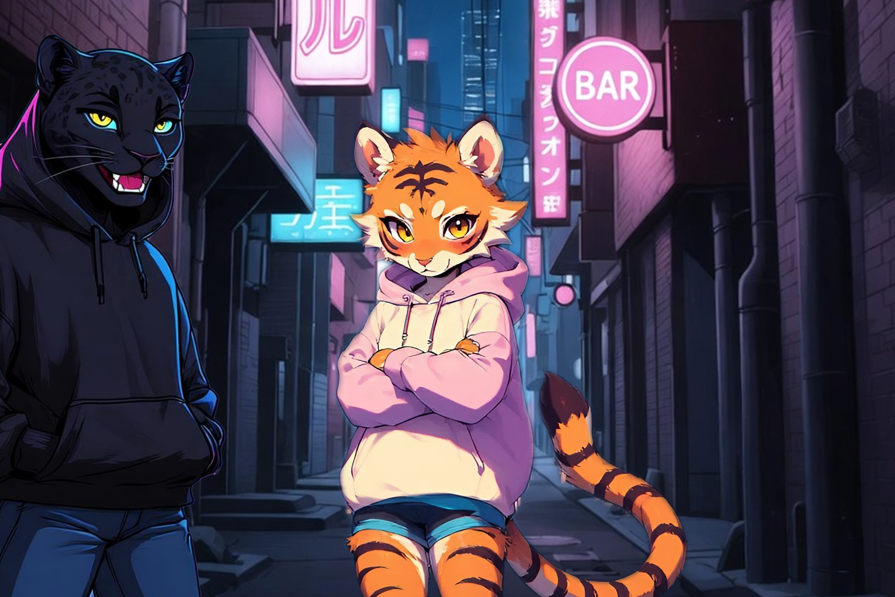 Из-за угла выскакивает маленькая оранжевая тигрица — Tira. Она явно подслушивала, руки скрещены, щёки надуты.